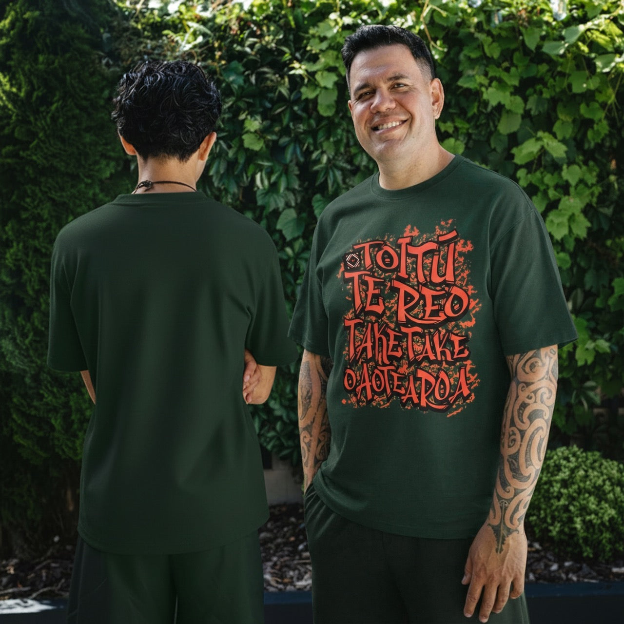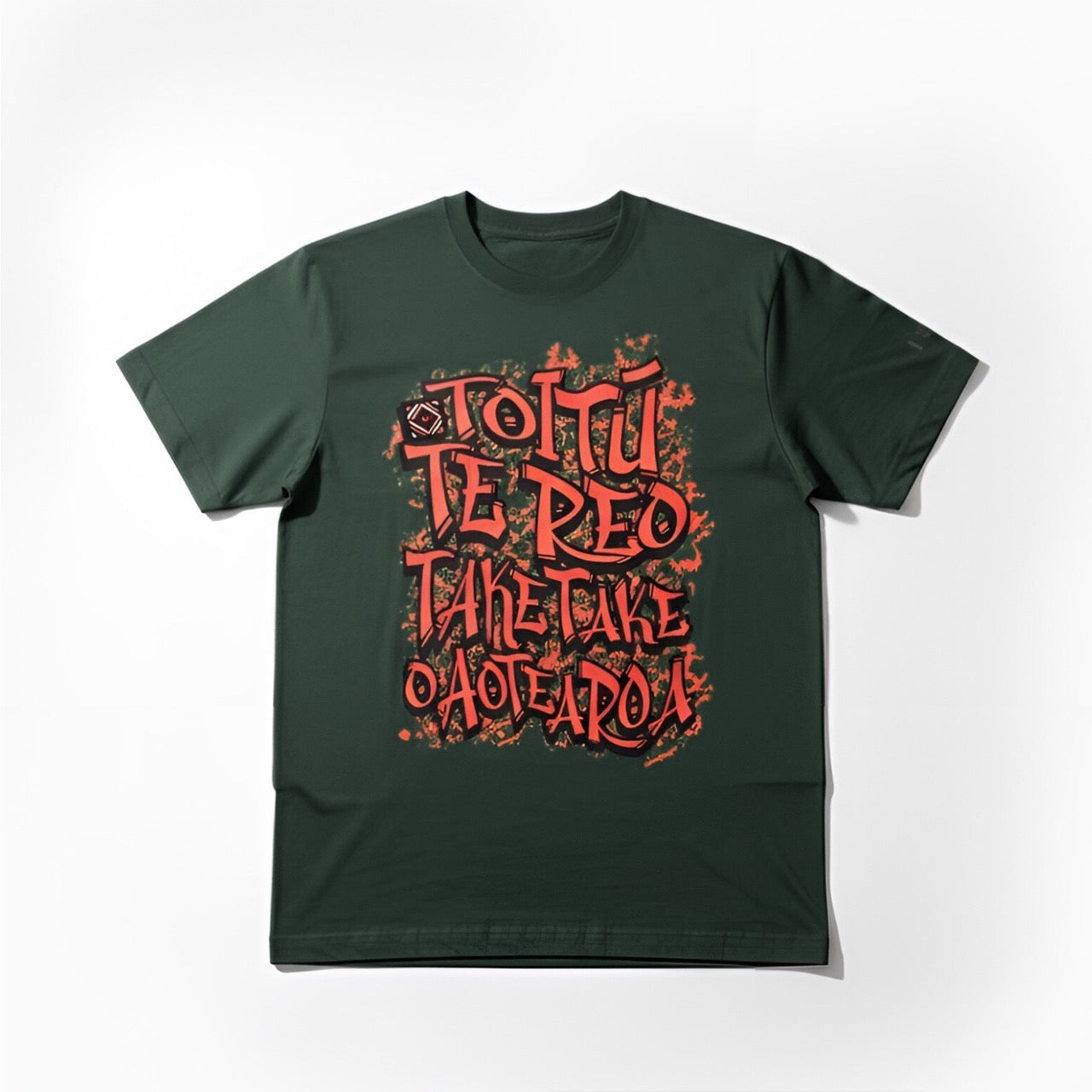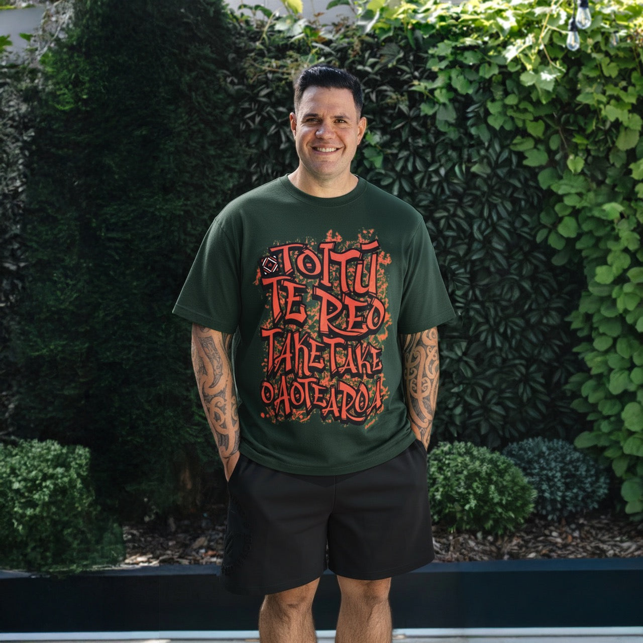 Screen printed with the unique graffiti design, this piece features the words “Toitū Te Reo Taketake o Aotearoa (“Uphold the Indigenous Language of Aotearoa”). This message, a branch of our Kaupapa range and Toitū Te Reo collection, is embroidered with our distinctive waharua pattern and Taiea logo on the left arm, that symbolises the encouragement and use of Te Reo. This tee is perfect to celebrate Te Wiki o Te Reo.