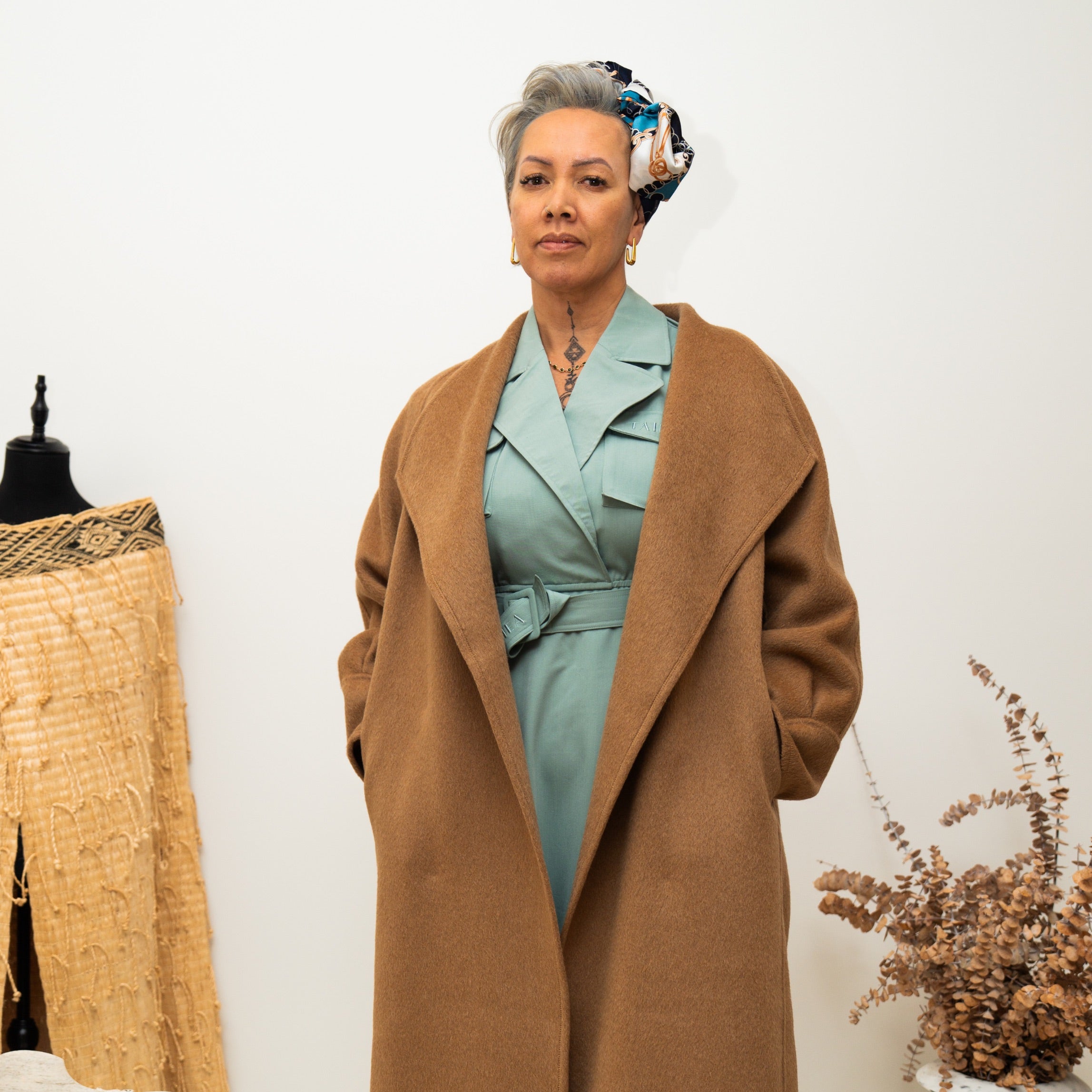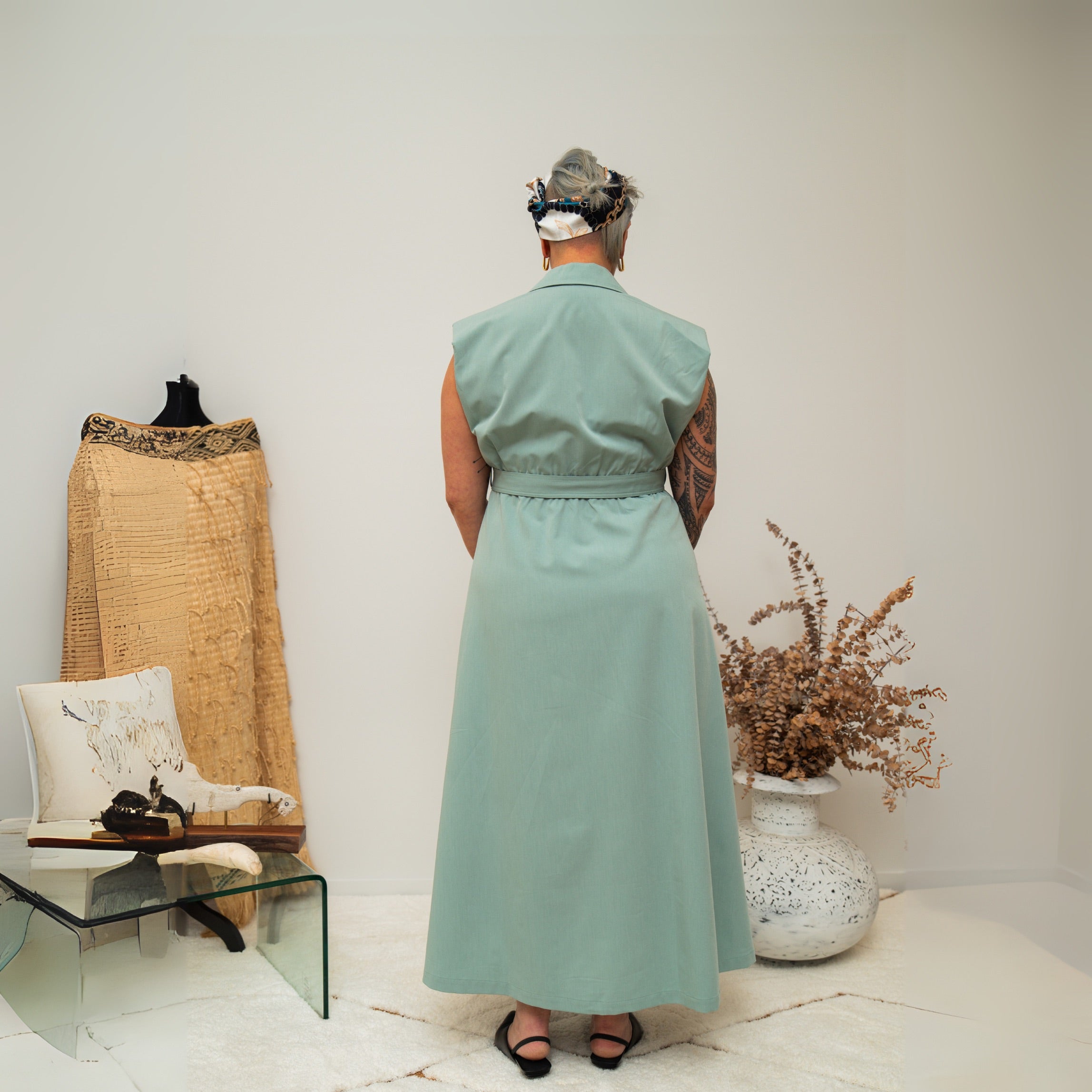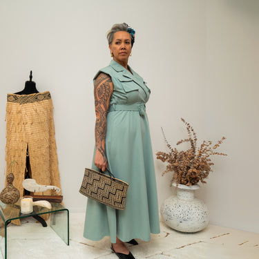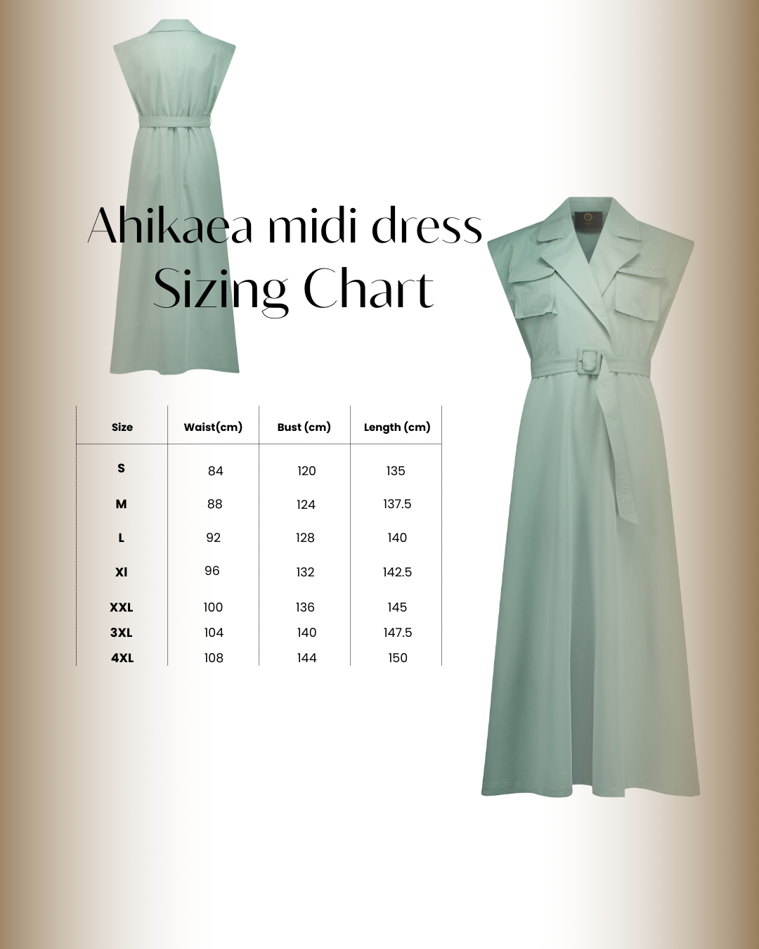 The Ahikaea Midi Dress features distinctive pull-on shoulder pads, a tailored waist, and two front breast pockets embroidered with the "TAIEA" logo. A waist buckle belt completes the flowing silhouette, perfect for spring and summer.