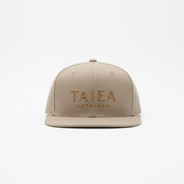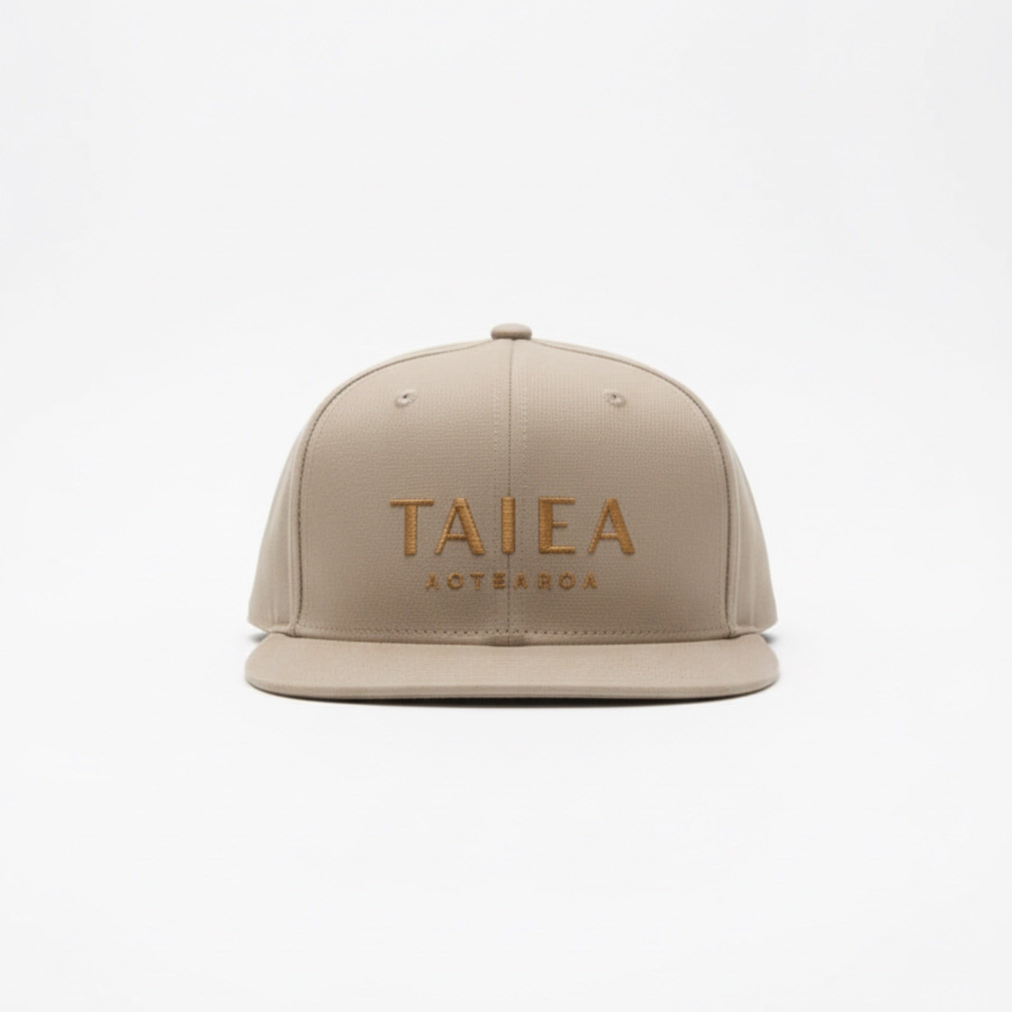 Our Taiea pōtae in beige - features our embroidered full Taiea logo in gold