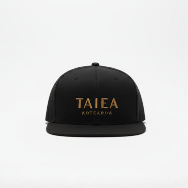 Our Taiea pōtae in black - features our embroidered full Taiea logo in gold